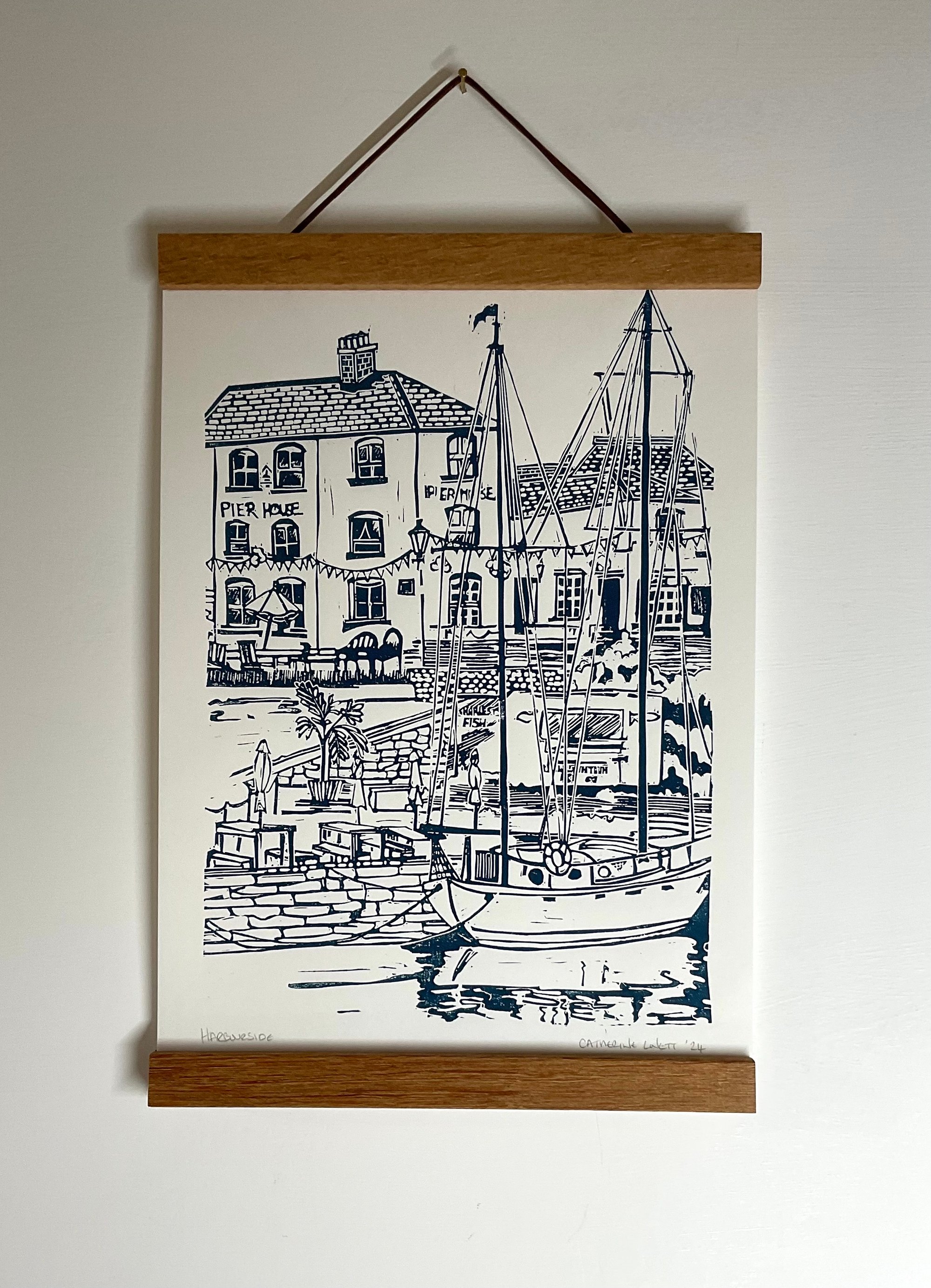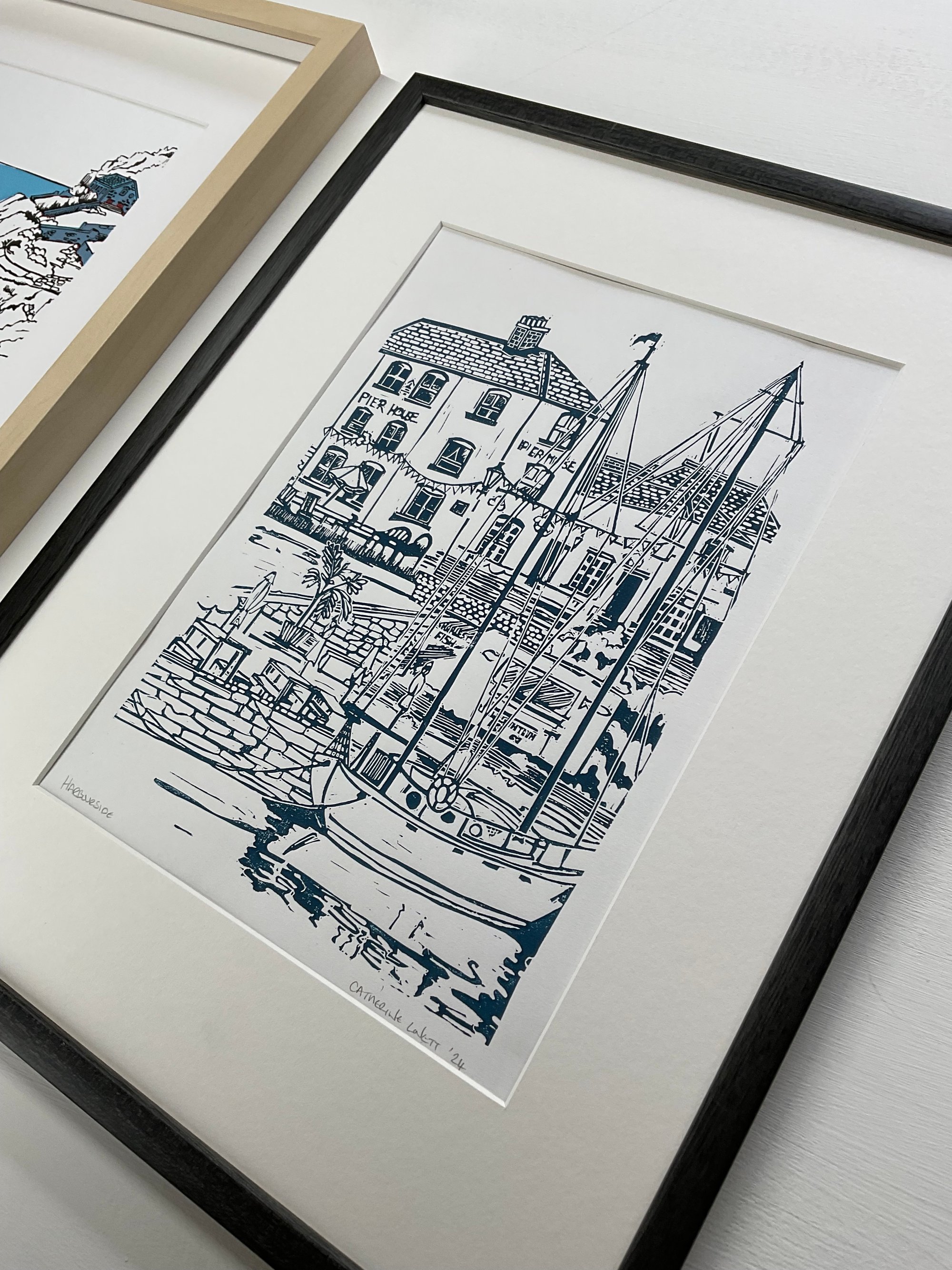 Hand carved lino prints available in a selection of colours inspired by the Cornish coast and countryside.