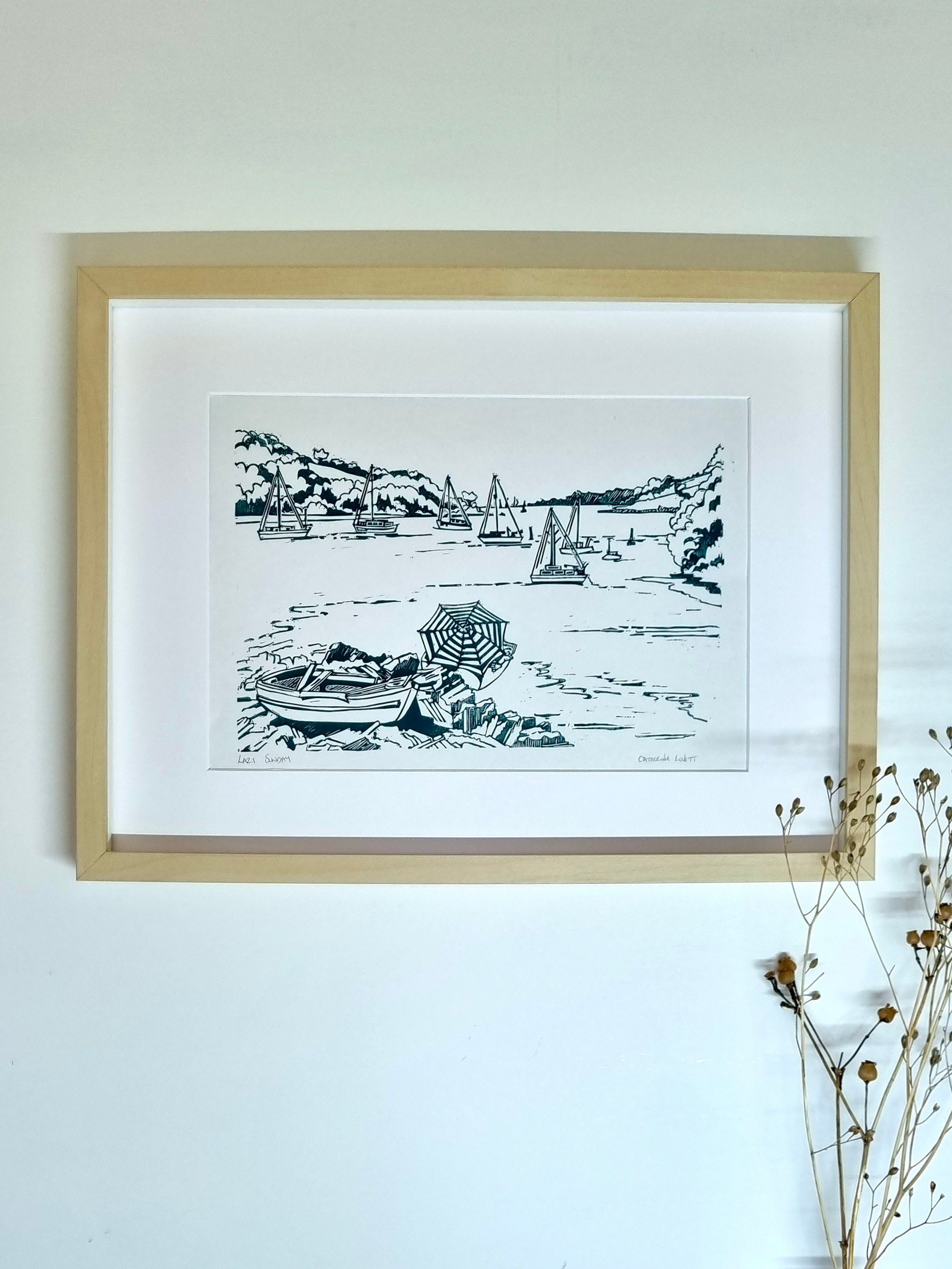 Hand carved lino prints available in a selection of colours inspired by the Cornish coast and countryside.