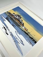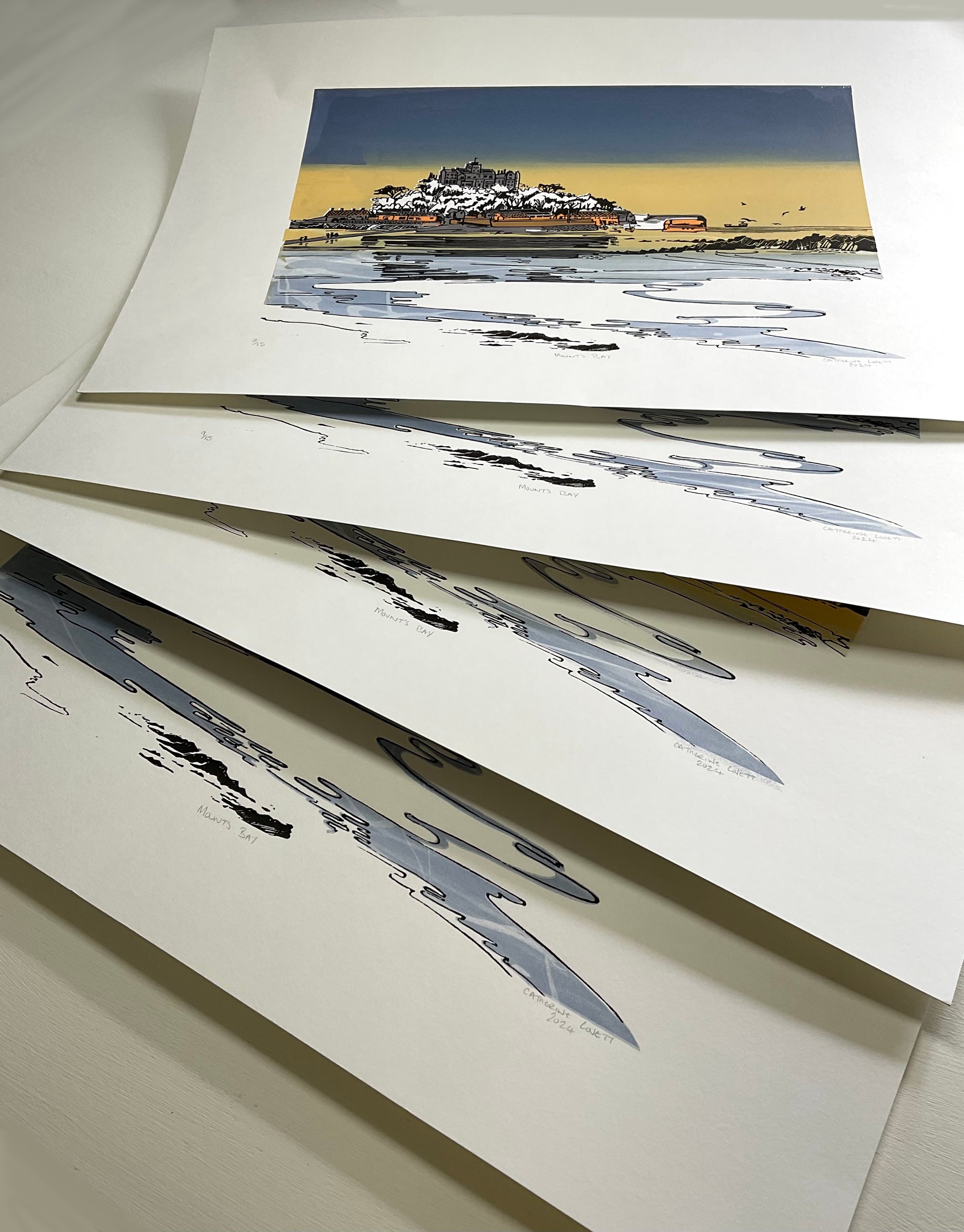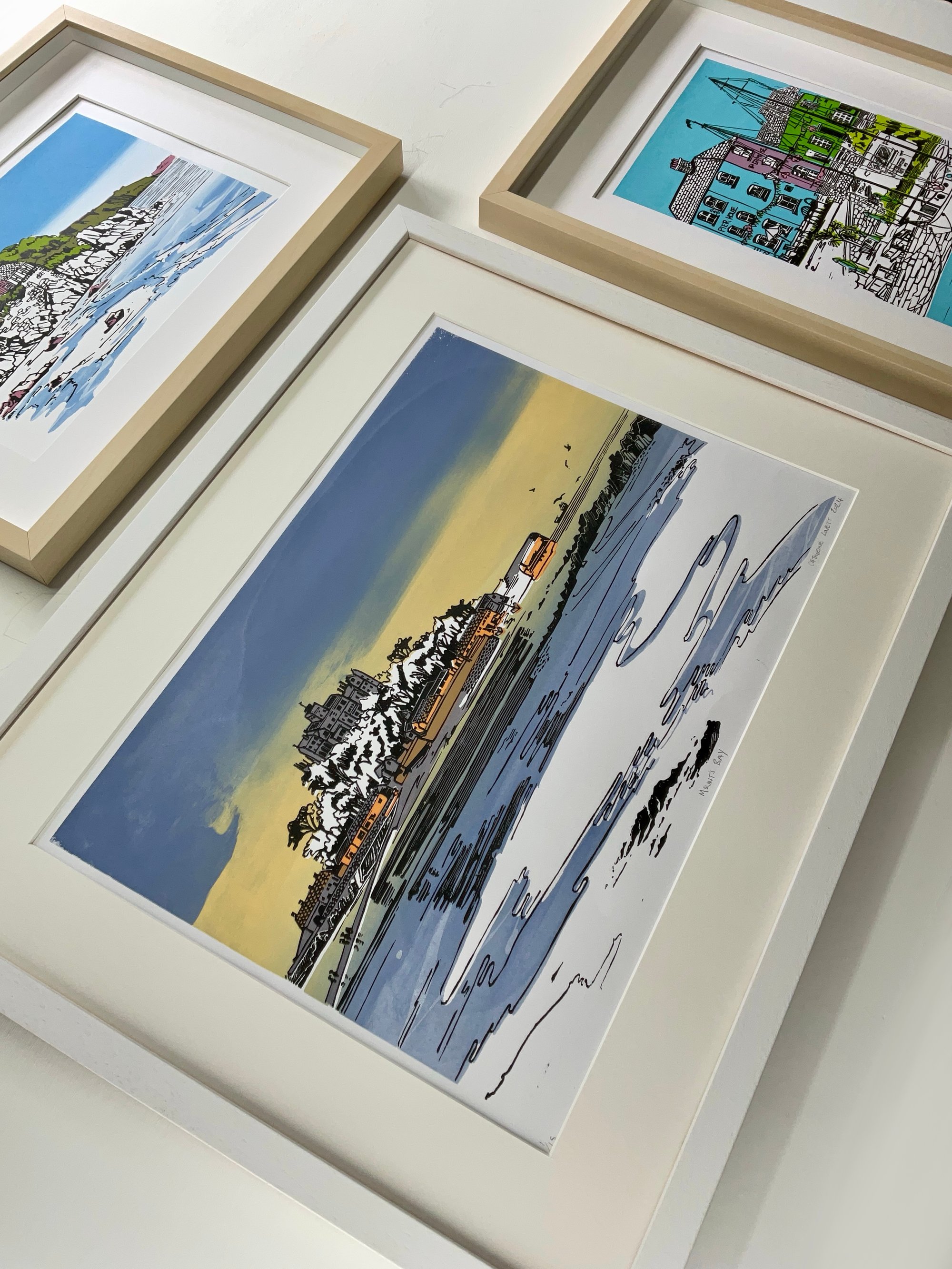 Each image is drawn by hand on location before being developed to create a unique print design. I create these artworks using three screen printed layers of bespoke mixed colours and a fourth layer that is hand carved from lino.