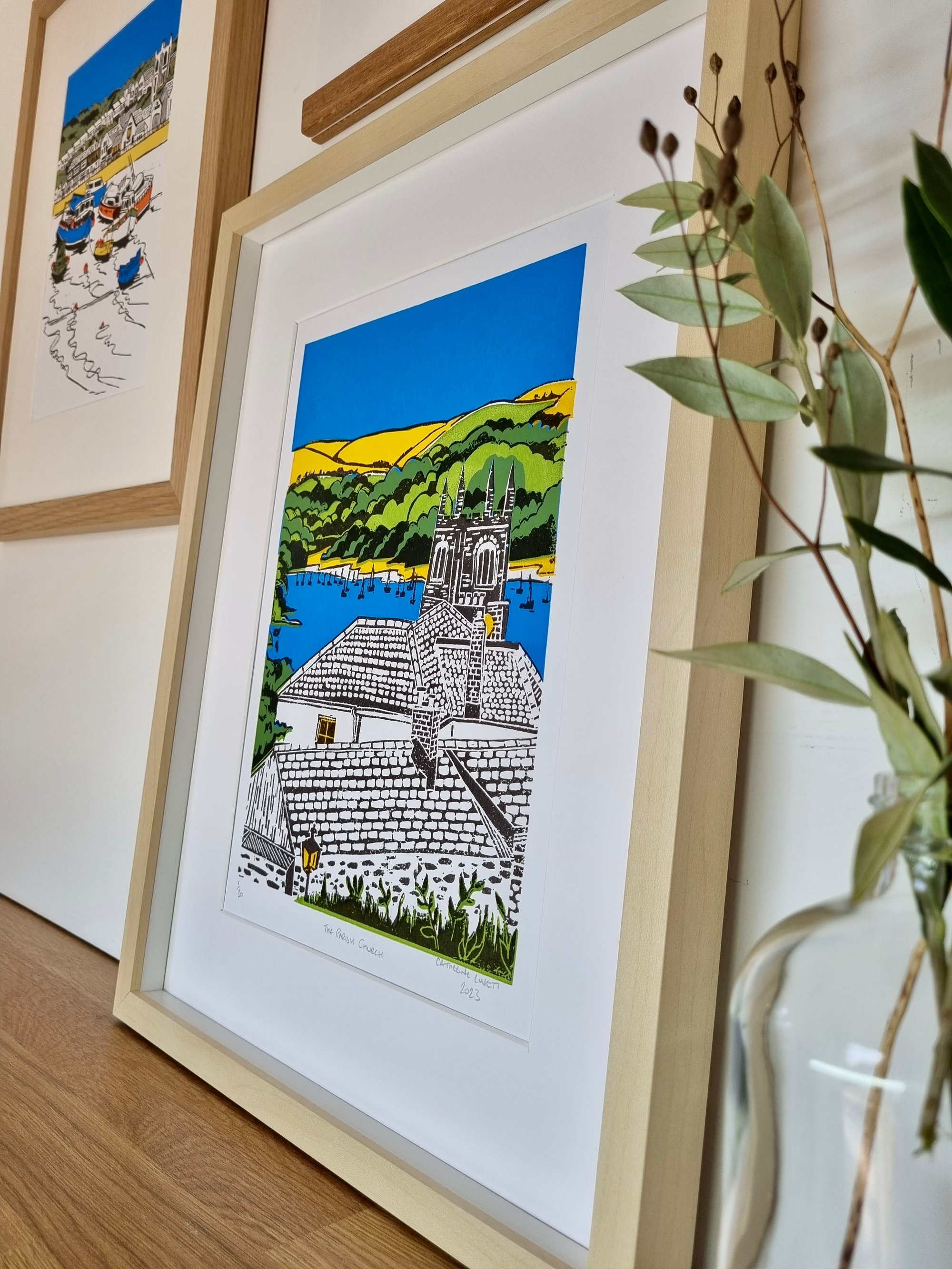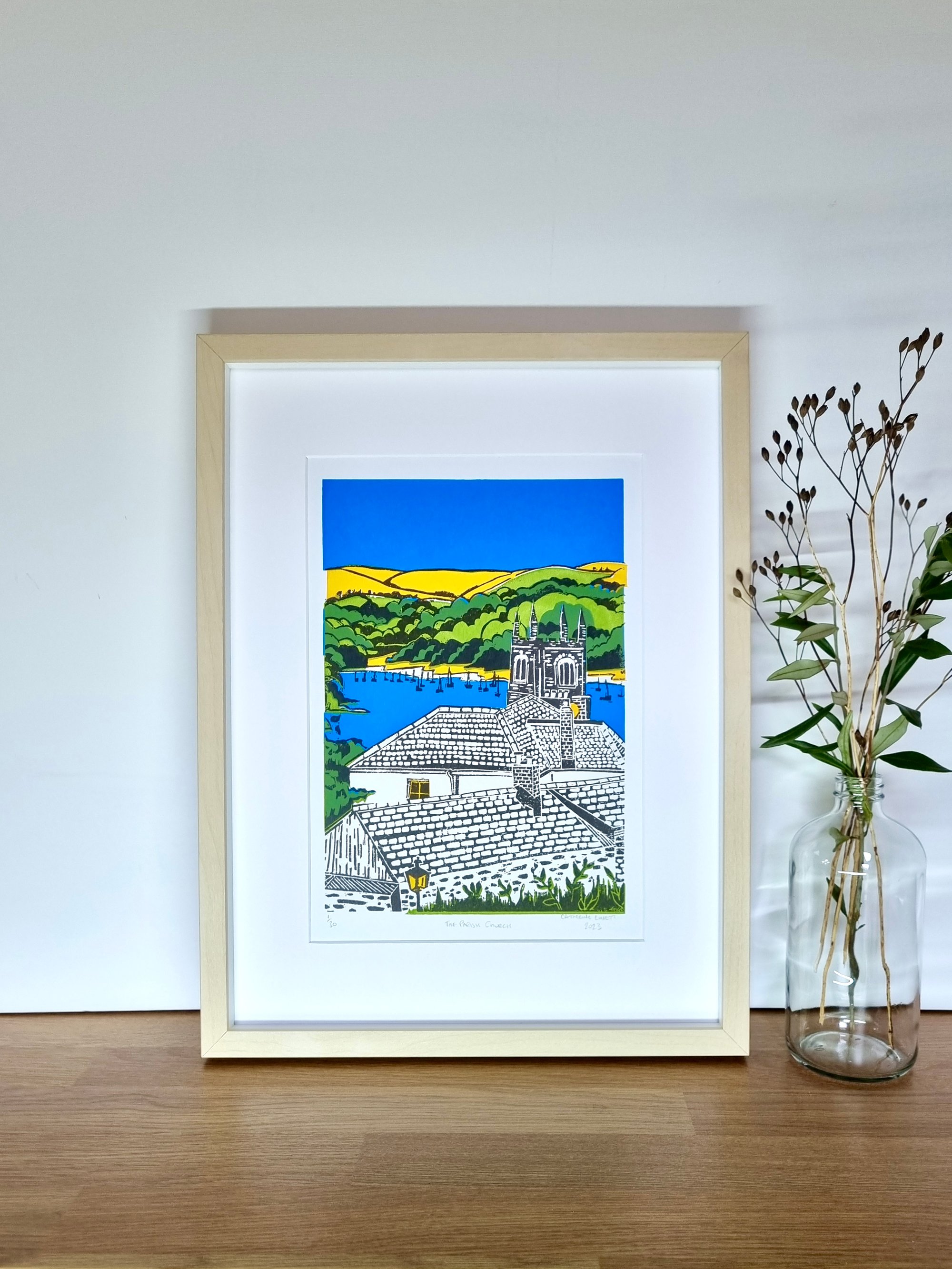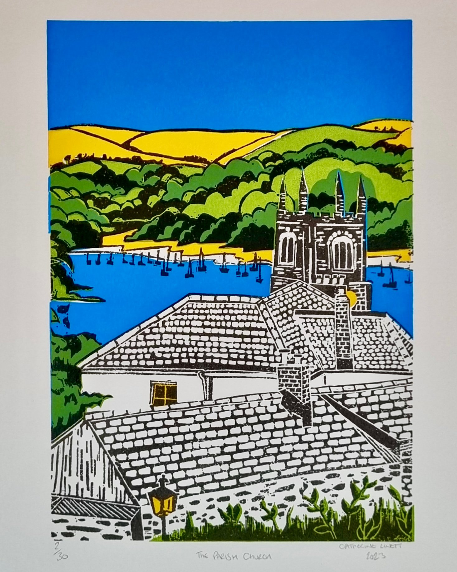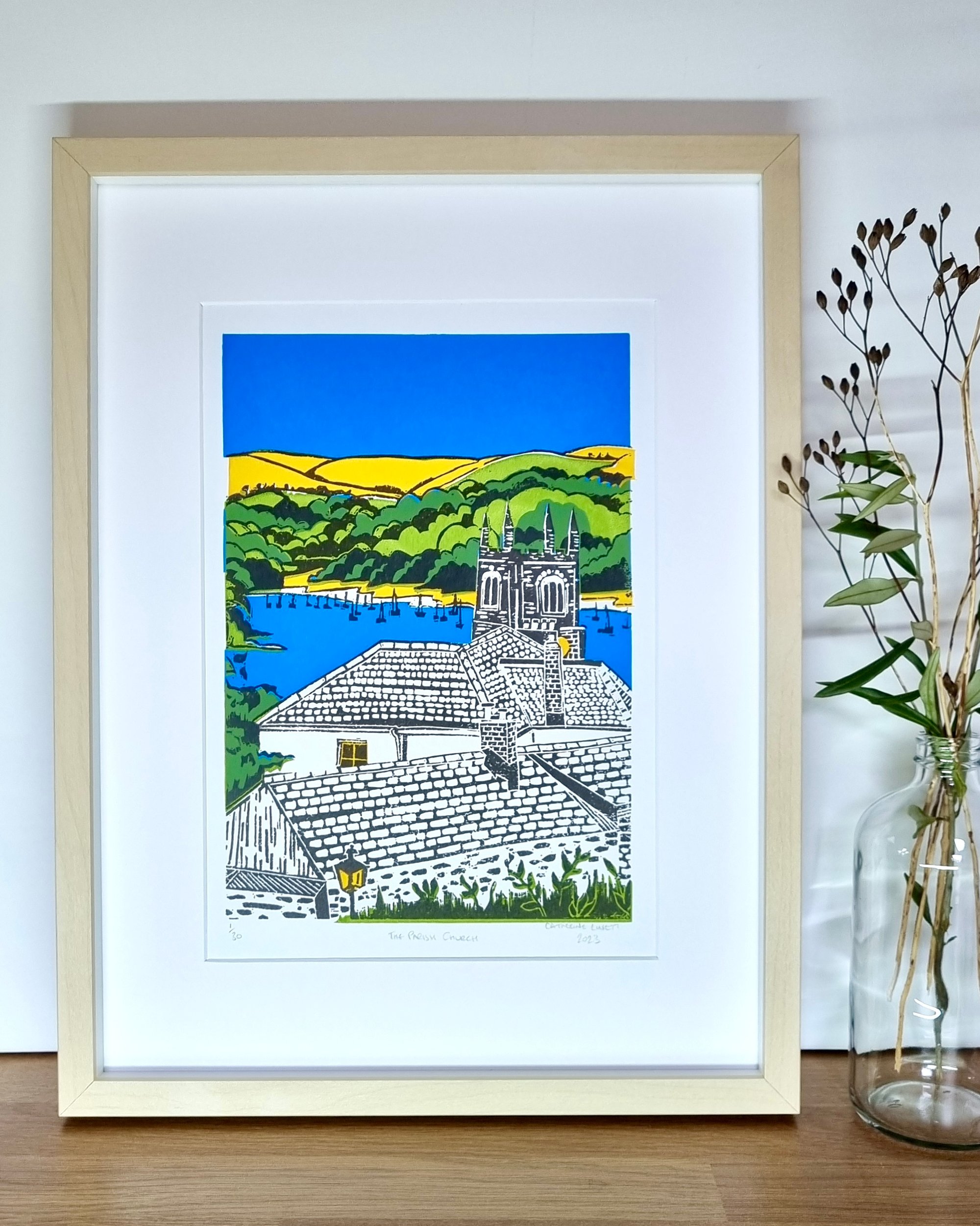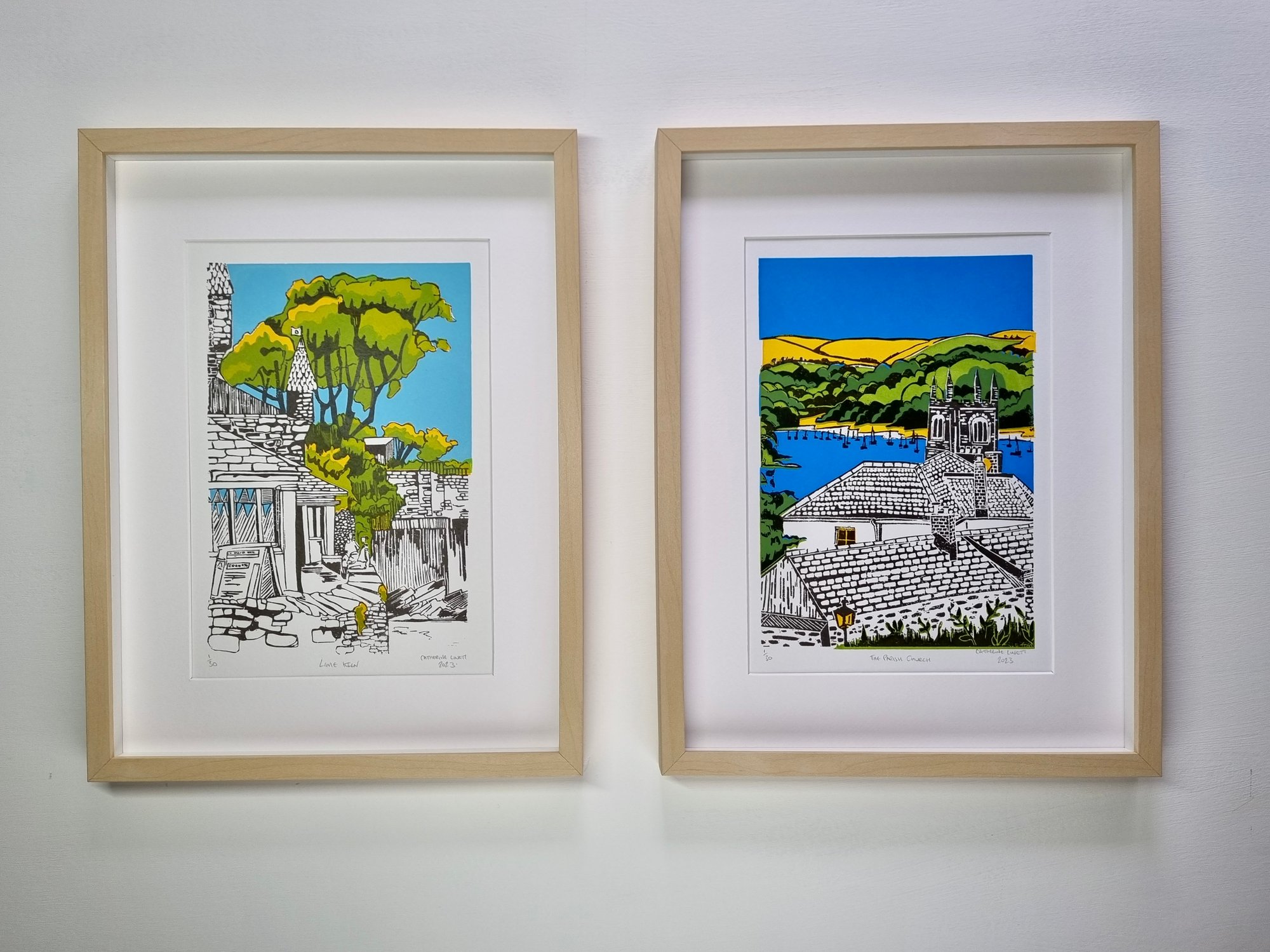 Each image is drawn by hand on location before being developed to create a unique print design. I create these artworks using three screen printed layers of bespoke mixed colours and a fourth layer that is hand carved from lino.