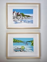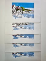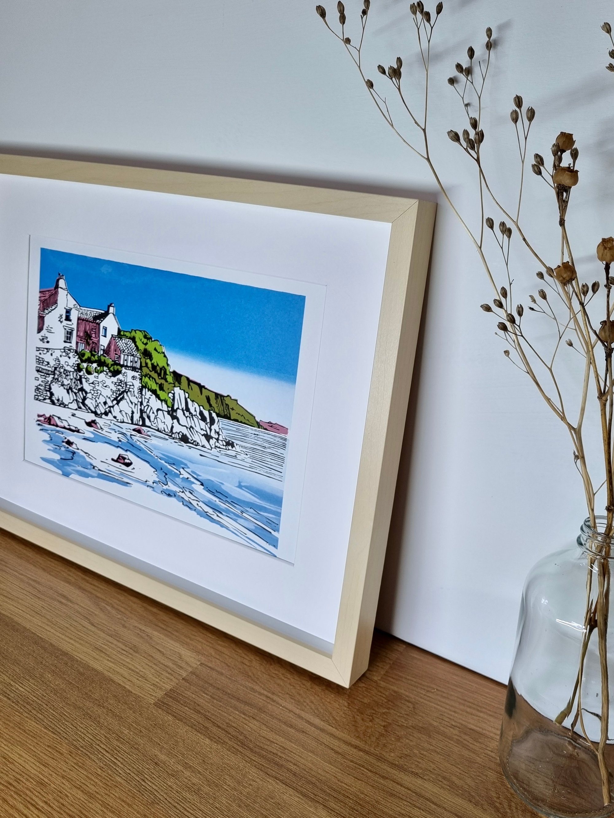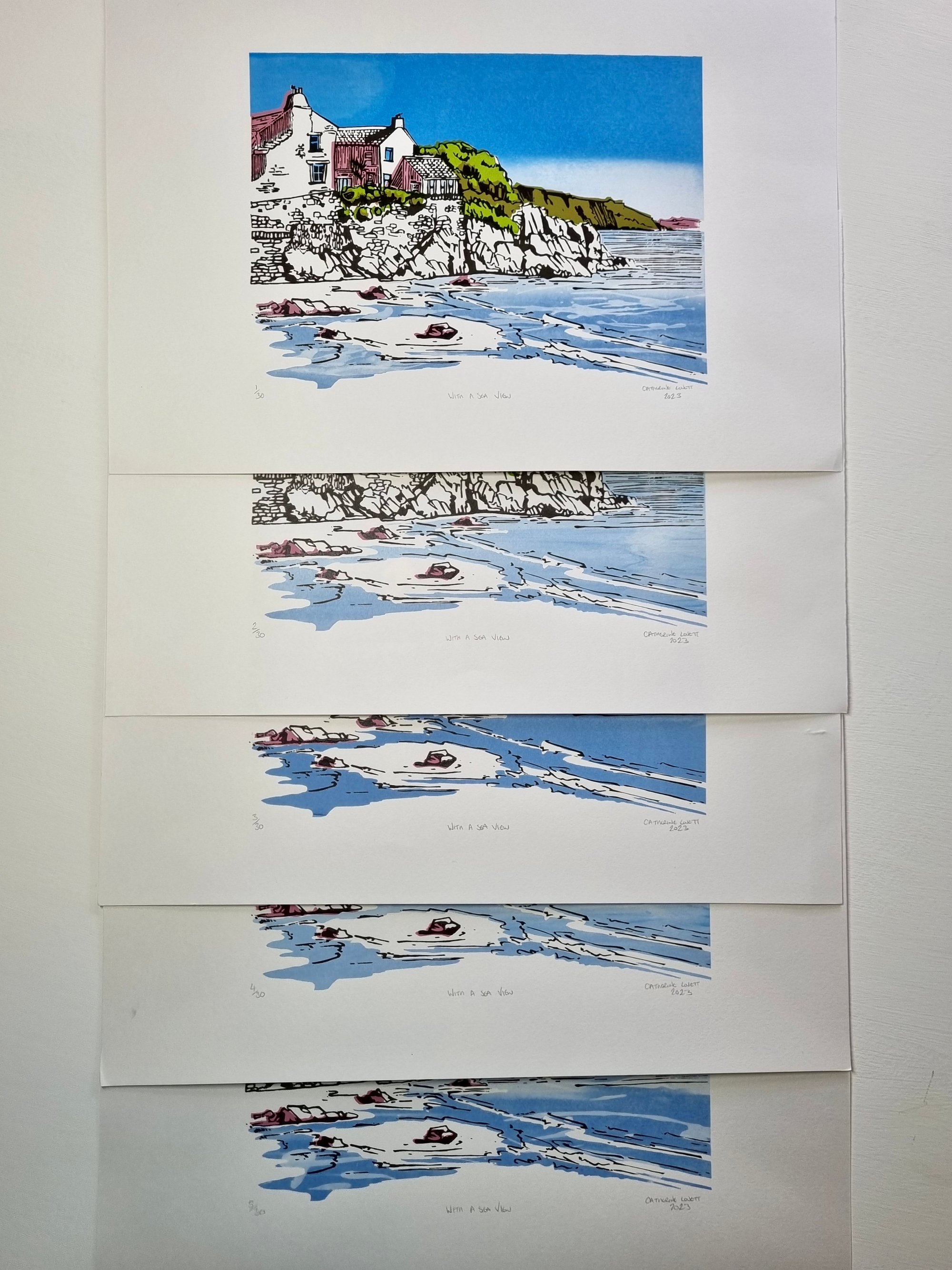 Each image is drawn by hand on location before being developed to create a unique print design. I create these artworks using three screen printed layers of bespoke mixed colours and a fourth layer that is hand carved from lino.