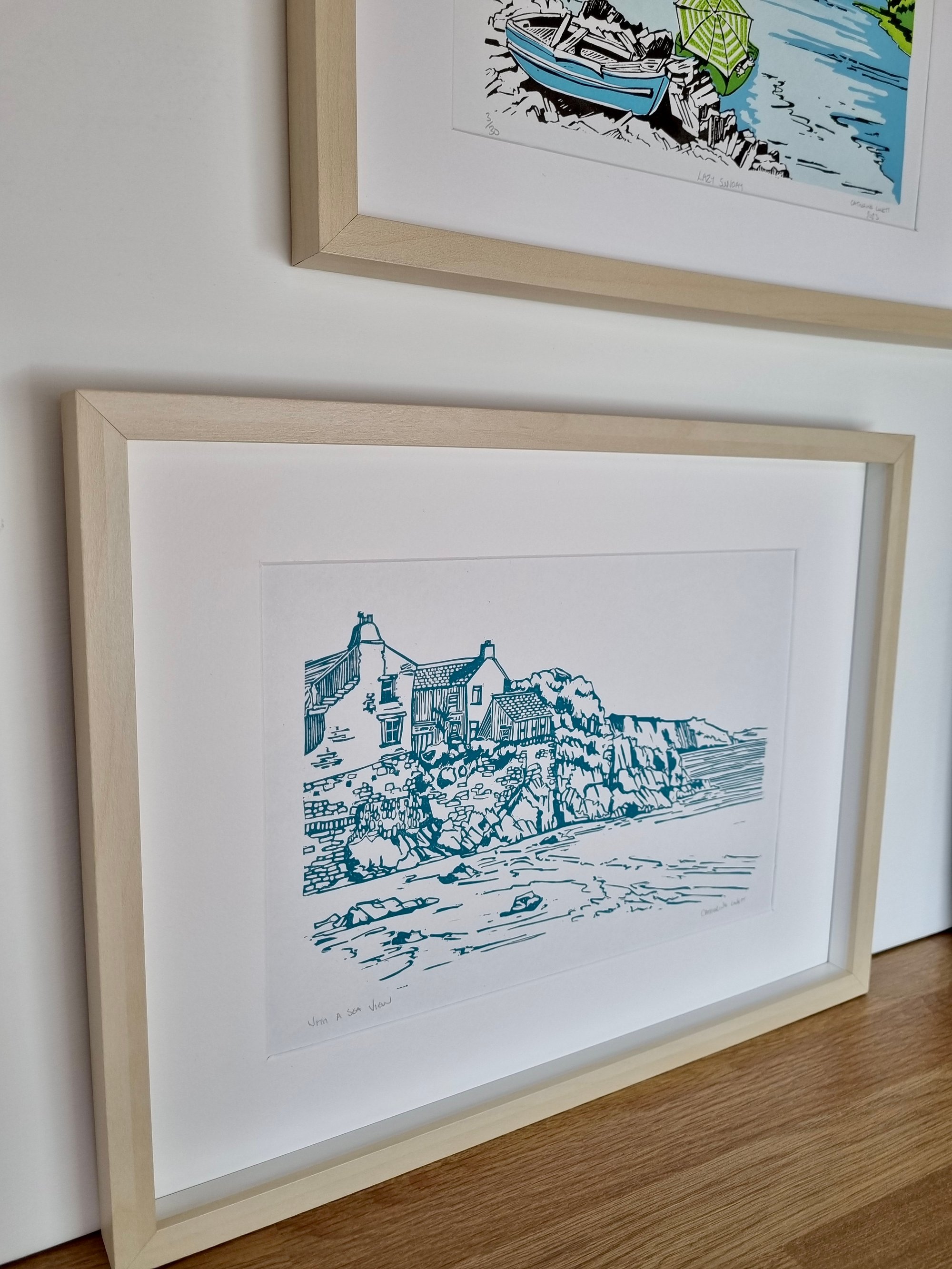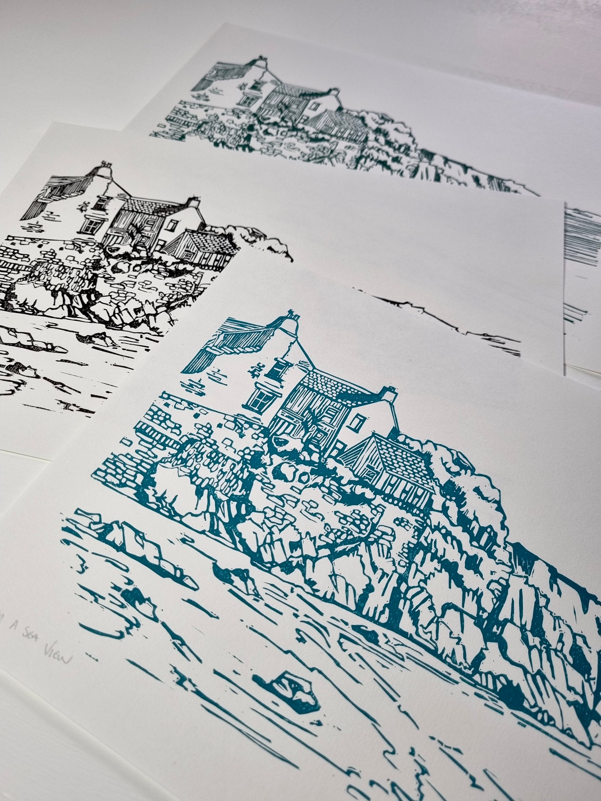Hand carved lino prints available in a selection of colours inspired by the Cornish coast and countryside.